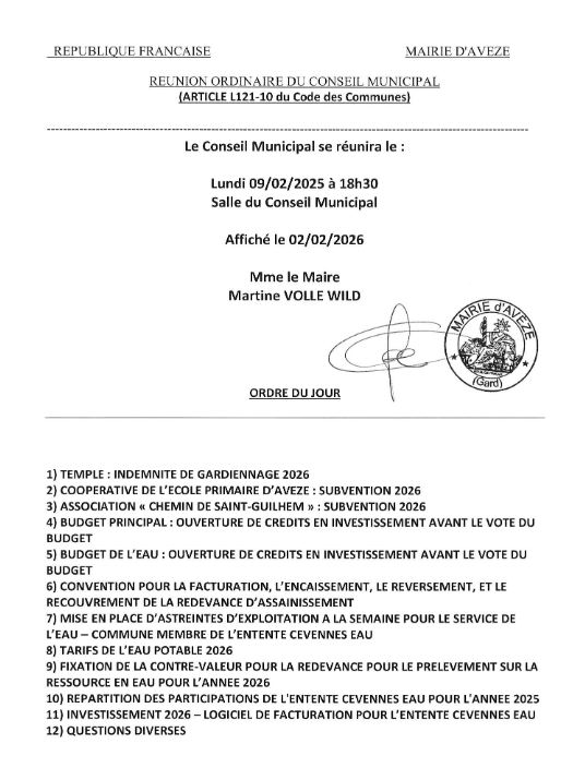 Le prochain conseil municipal aura lieu le lundi 9 février 2026 à 18h30 en Mairie.